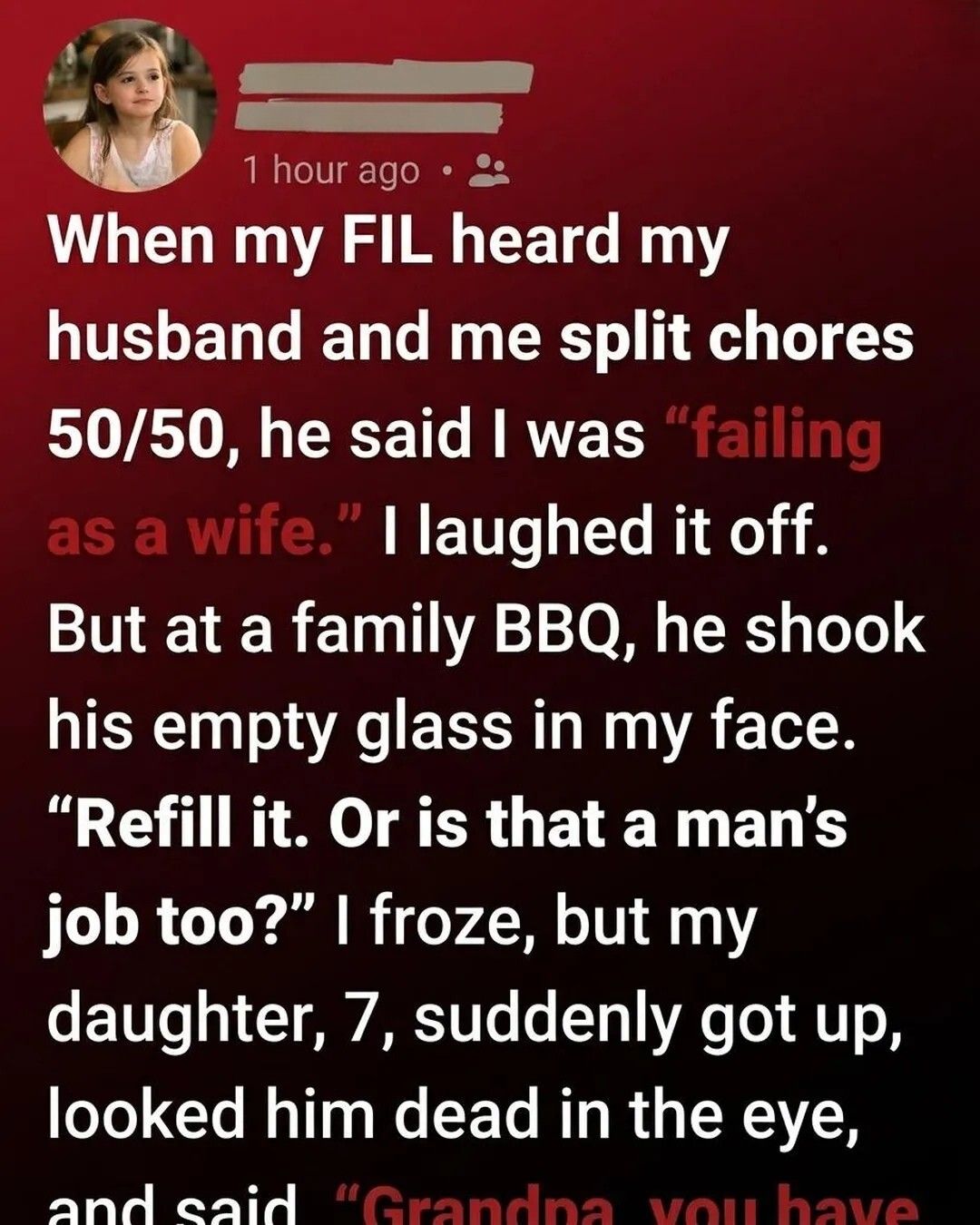 —cooking, cleaning, raising our daughter together—he let out a short laugh and shook his head. Then he said it, casually, like it was nothing: “Well, sounds like you’re failing as a wife.” I didn’t react. Not really. I smiled politely, shrugged it off, and let the conversation move on. I’ve learned over time that not every comment deserves a response. Some things are better ignored, especially when they come from people set in their ways. Still, the words…