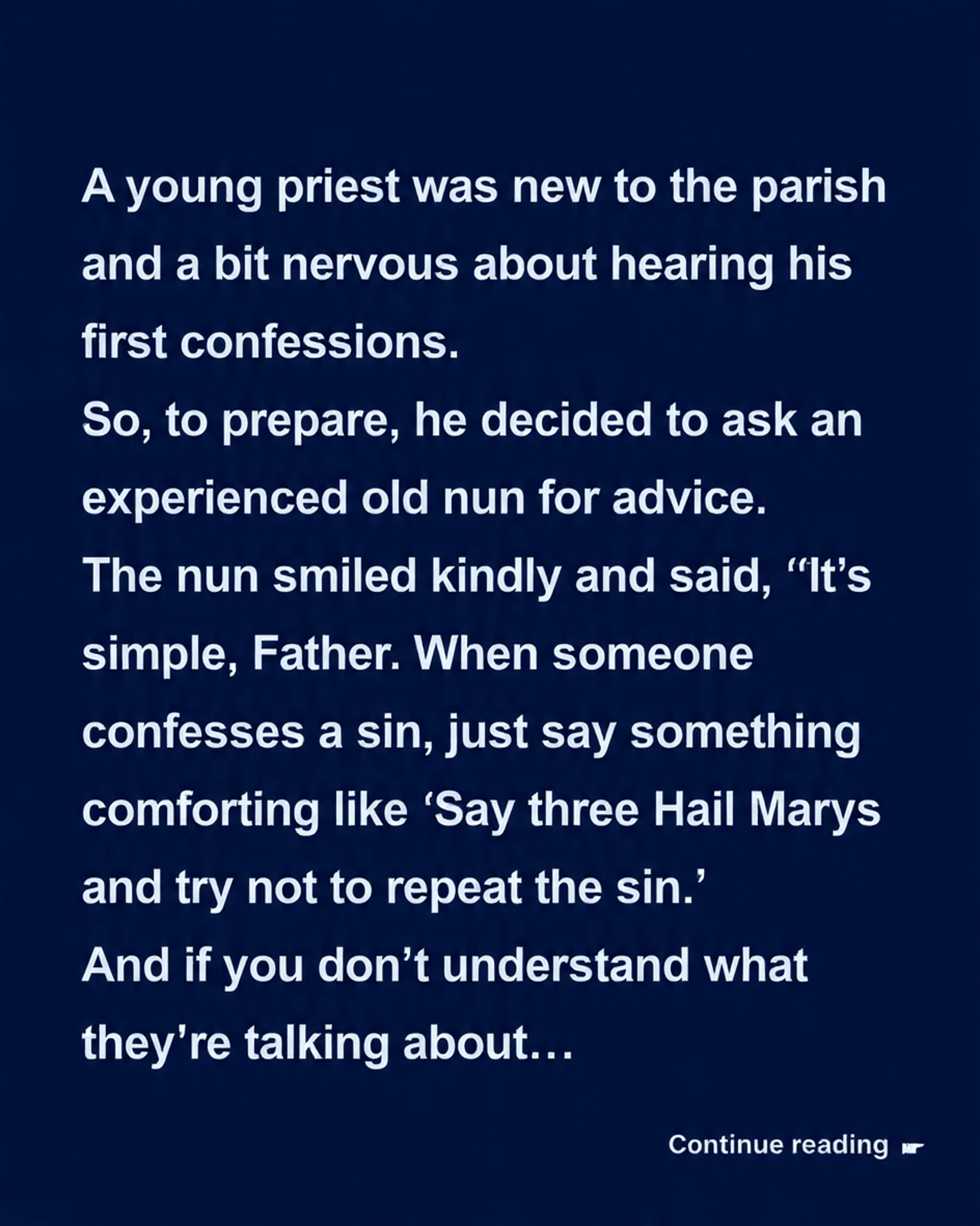 The nun smiled kindly and said, “It’s simple, Father. When someone confesses a sin, just say something comforting like ‘Say three Hail Marys and try not to repeat the sin.’ And if you don’t understand what they’re talking about… just nod wisely.”