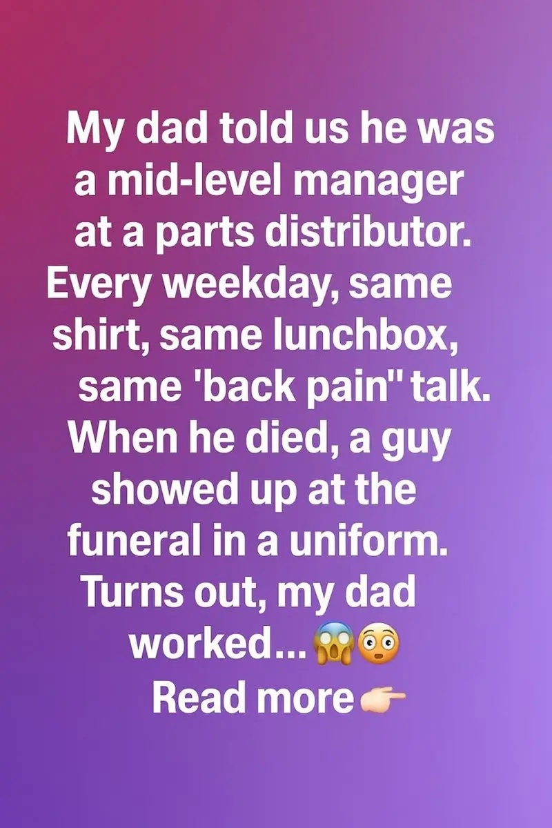 My dad told us he was a mid-level manager at a parts distributor. Every weekday, same shirt, same lunchbox, same “back pain” talk. When he died, a guy showed up at the funeral in a uniform.