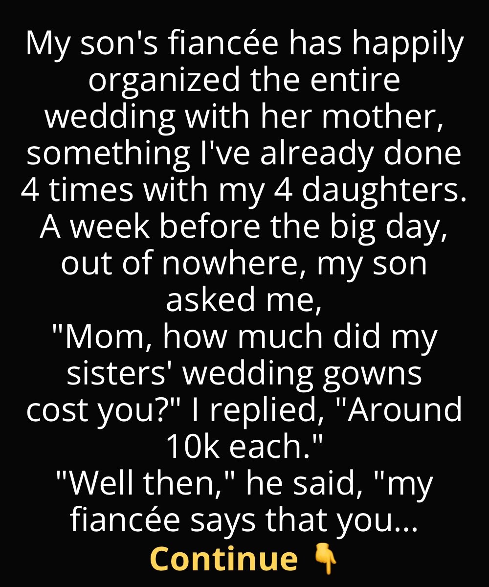 “Well then,” he said, “my fiancée says that now that it’s my turn to get married, you should give me what you gave my sisters for their weddings in order to be a fair parent.” ”What are you saying?” I gasped. “I should receive the equivalent of what was spent on my sisters’ wedding gowns in cash,” he explained. “But you already have your tuxedo rented and ready!