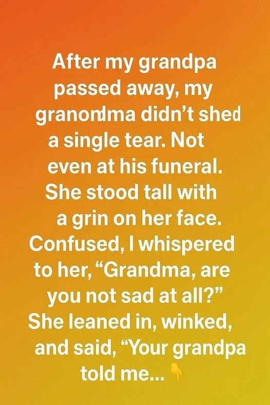 Confused, I whispered, “Grandma, are you… not sad at all?” She smiled softly and said, “Your grandpa told me not to cry when he left — because he’d find a way to make me smile again.” I didn’t understand how she could smile when the man she’d loved for sixty-two years was gone. Yet, she stayed composed, even joking that Grandpa would’ve hated all the attention. A week later, I visited her.