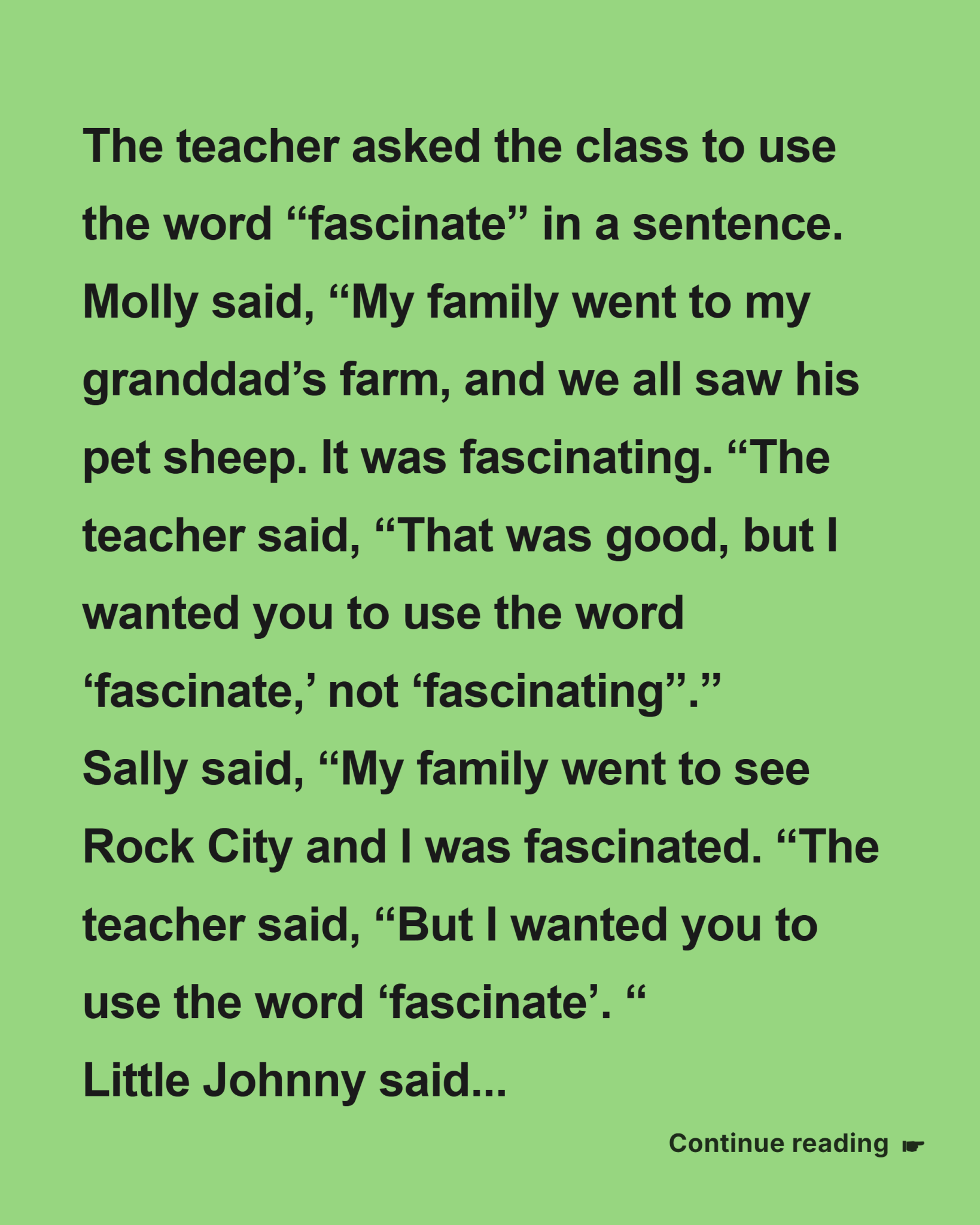 Sally raised her hand. She said, “My family went to see Rock City and I was fascinated. “The teacher said, “Well, that was good Sally, but I wanted you to use the word ‘fascinate’. “Little Johnny raised his hand, but the teacher hesitated because she had been burned by Little Johnny before.