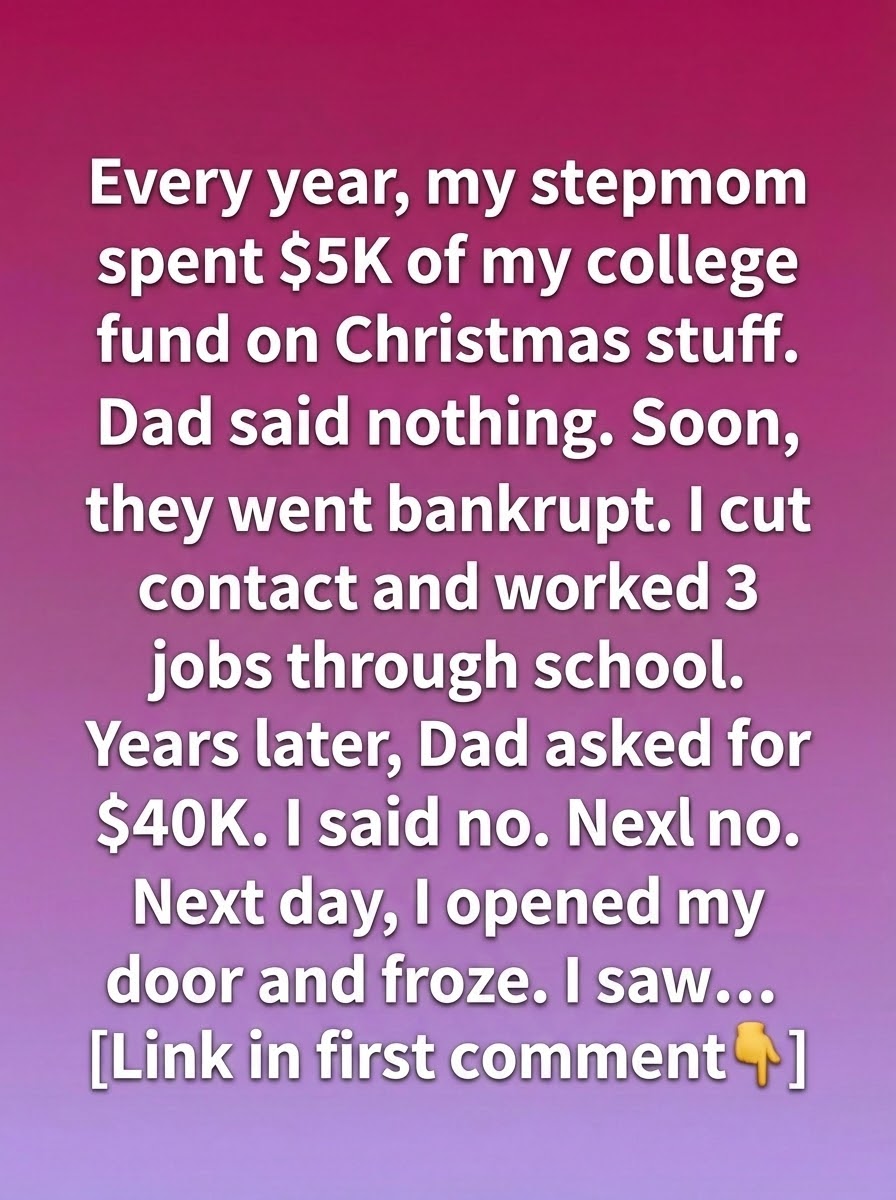 Every year, while I carefully planned for college and dreamed about a future built on independence, my stepmother treated my education fund like a holiday expense account. Thousands disappeared into decorations, gifts, and celebrations that looked impressive from the outside but left nothing lasting behind. My father knew. He always knew. Yet he stayed silent, choosing peace in his marriage over responsibility to his child. When everything finally collapsed and bankruptcy followed, I wasn’t surprised—just tired. I walked away, not out of anger, but out of self-preservation, and learned early that if I wanted stability, I would have to create it myself.