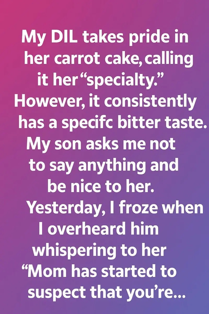 However, it consistently has a specific bitter taste. My son asks me not to say anything and just be nice to her. Yesterday, I froze when I overheard him whispering to her, “Mom has started to suspect that you’re…”