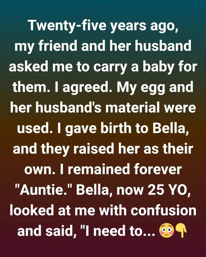 Now, at 25 years old, Bella approached me with something unexpected. She had recently learned the full story of her birth — the genetic truth behind her existence. She looked at me, not with anger, but with a mix of confusion and longing.