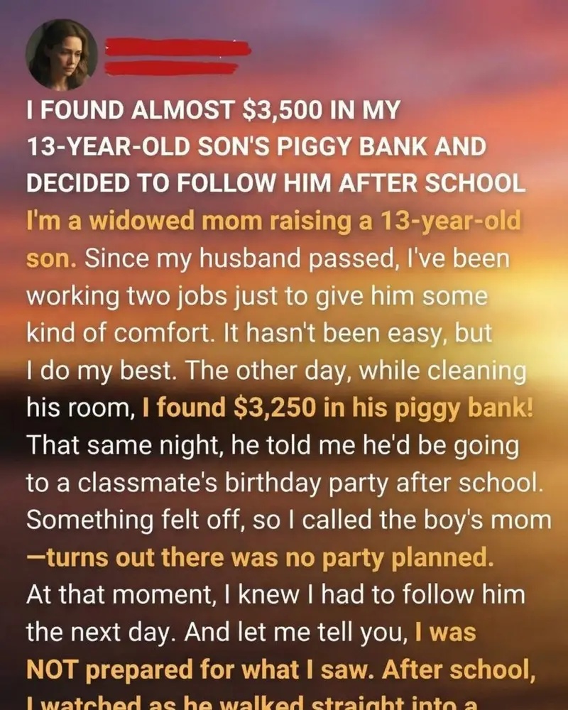 I wasn’t angry or suspicious at first—just confused. Life had been demanding since my husband passed away, and raising a 13-year-old alone meant constantly balancing work, parenting, and worry. Finding several thousand dollars in spare change and bills didn’t match what I knew about my son’s daily routine. He was responsible, polite, and rarely asked for anything. Still, the discovery made me pause. I realized this wasn’t about money alone; it was about understanding what was happening in his world when I wasn’t around.