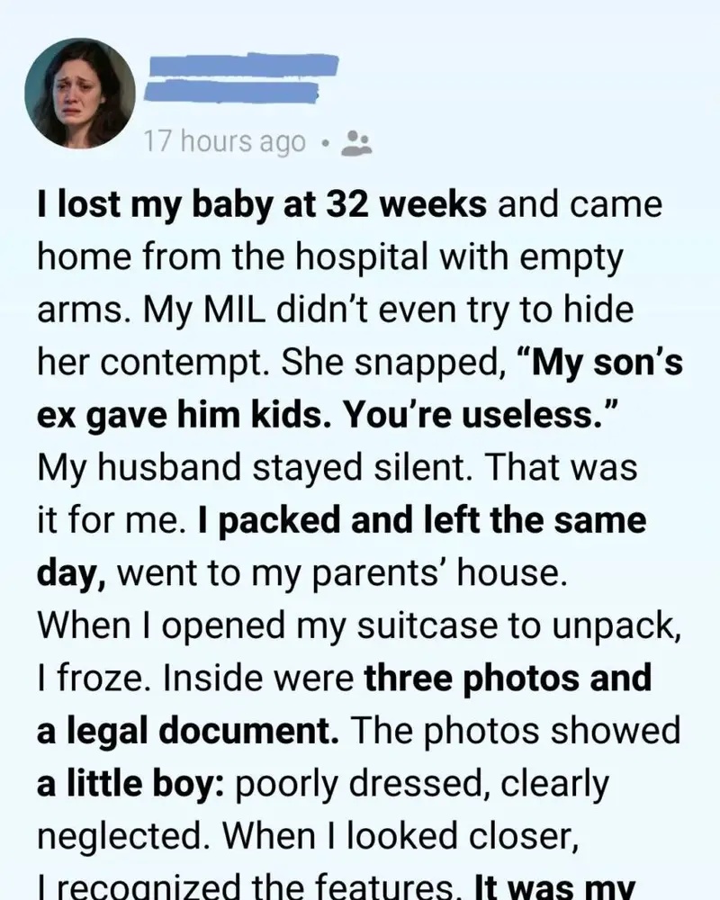 At the bottom of my suitcase were three photographs and a legal document I hadn’t packed. The photos showed a little boy—thin, poorly dressed, eyes too old for his face. In one picture he stood barefoot on a cracked sidewalk. In another, he slept curled against a wall, ribs visible beneath his shirt.
