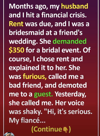 Months ago, my husband and I hit a financial crisis. Rent was due, and I was a bridesmaid at a friend’s wedding. She demanded $350 for a bridal event. Of course, I chose to pay rent and explained it to her. She was furious, called me a bad friend, and demoted me to a guest. Yesterday, she called me. Her voice was shaky. “Hi, it’s serious. My fiancé and I need to borrow some money. I know it’s been a while since we talked, but you’re the only one who can help us.” Turns out, they had both been laid off and were drowning in debt. The same friend who once shamed me for not spending money on her event now had nowhere to turn.