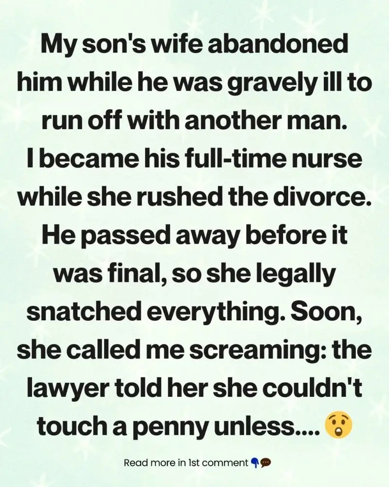 The lawyer had finally explained the details she’d skimmed over in her excitement to inherit. Yes, she inherited everything—on paper. But she couldn’t access a single cent until she fulfilled one condition my son had added after she left.