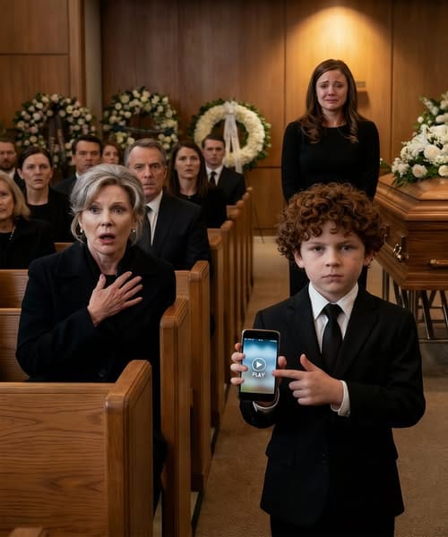 Evan, my eight-year-old son, stood up from the pew. His black suit hung awkwardly on his growing frame. He held Mark’s phone with both hands, the case worn from years of use. His face was pale but composed, the way it looked when he focused on something important.