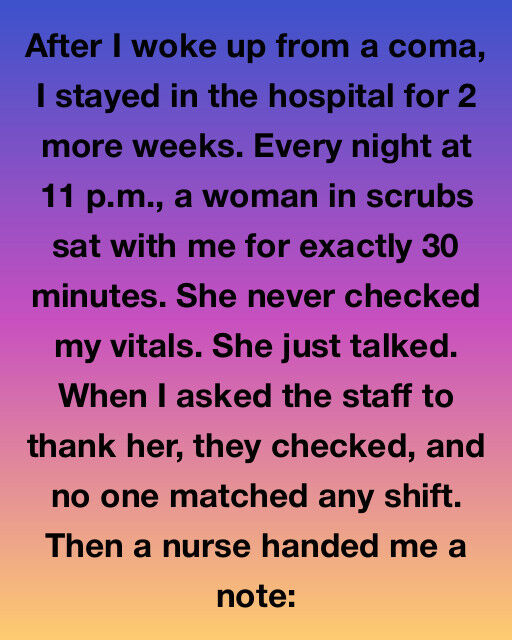 Every night at exactly eleven, a woman in scrubs came into my room, pulled up a chair, and talked for thirty minutes. She never checked my vitals or touched the machines—she just told ordinary stories about her garden, a piano recital, a lemon cake recipe. I barely had the energy to respond, but I listened like her voice was oxygen.