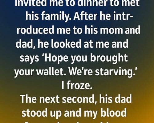 Last night, my boyfriend took me out to dinner to finally meet his family. After introducing me to his parents, he turned to me with a grin and said, “Hope you brought your wallet—we’re really hungry.” I completely froze. Then his father suddenly stood up, and my heart nearly stopped when he quickly added,…