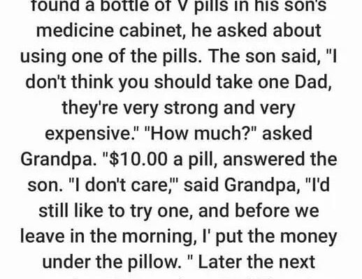 Grandma and Grandpa were visiting their kids overnight. When Grandpa found a bottle of V pills in his son’s medicine cabinet, he asked about using one of the pills. The son said, “I don’t think you should take one Dad, they’re very strong and very expensive.” “How much?” asked Grandpa. “$10.00 a pill, answered the…