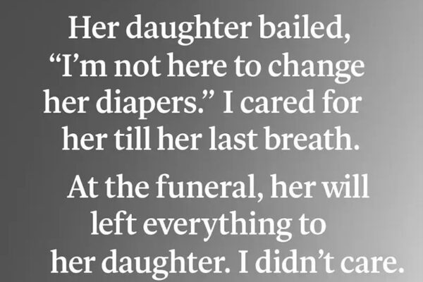My stepmom got very ill, in a vegetative state for months before she died. Her daughter bailed,   “I’m not here to change her diapers.” I cared for her till her last breath. At the funeral, her will left everything to her daughter. I didn’t care. Next day, her daughter called, sobbing and yelling. Turns…