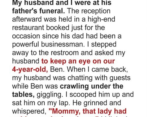 Grief hung heavy over the reception hall on the day we buried my father-in-law, a man I loved like my own. Everything felt muffled: voices, footsteps, even my own heartbeat. But children don’t see grief the way adults do. My four-year-old son, Ben, wandered between tables, crawling underneath white linen like it was a…
