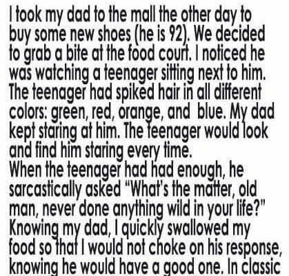 Last weekend, I took my 92-year-old dad to the mall to buy a new pair of shoes. After finding the right pair, we sat down at the food court beside a teenager with wild, spiked hair—green, red, orange, and blue all blazing together. My dad watched him quietly, not with judgment but with the gentle…