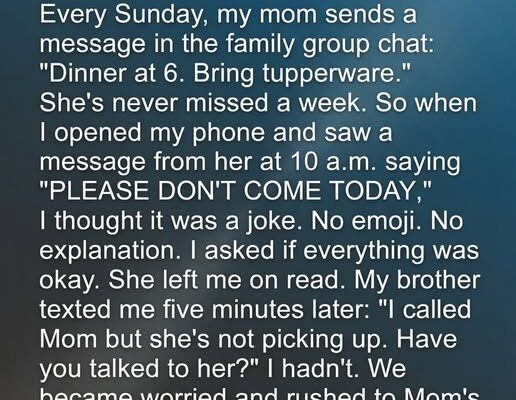 The text message broke our usual Sunday routine with just five blunt words. No explanation, no warmth —just a sudden wall between us. We drove over in silence, bracing for disaster. The porch light glowed, the house felt unnaturally still, and when we stepped into the kitchen, we saw a stranger sitting where Dad once…