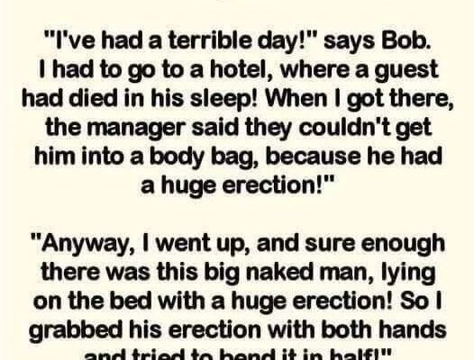 Bob, an undertaker, recently came home with a black eye. His wife asked him, “What happened to you?” “I’ve had a terrible day!” says Bob. “I had to go to a hotel, where a guest had died in his sleep! When I got there, the manager said they couldn’t get him into a body bag,…