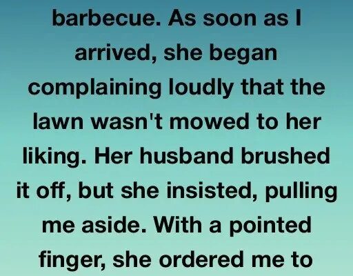 My boss’s wife, Karen, invited me to their weekend barbecue. As soon as I arrived, she began complaining loudly that the lawn wasn’t mowed to her liking. Her husband brushed it off, but she insisted, pulling me aside. With a pointed finger, she ordered me to take care of it, or else she would tell…