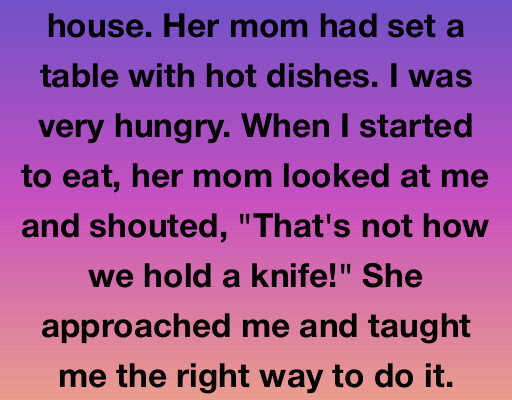 I grew up very poor. At 12, I went to a friend’s fancy house. Her mom had set a table with hot dishes. I was very hungry. When I started to eat, her mom looked at me and shouted, “That’s not how we hold a knife!” She approached me and taught me the right way…