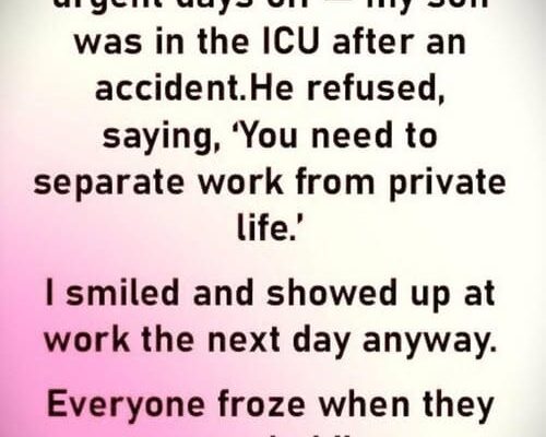 The morning I walked into the office with a stack of meticulously labeled folders, no one there suspected I’d spent the entire night in an ICU. My son had been rushed in after a sudden accident, and when I asked my boss for five emergency days off, he refused—reminding me, with chilling detachment, to…
