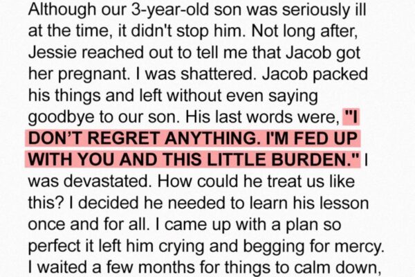 While on a business trip to support our sick son’s medical bills, I never imagined my world would shatter. My husband Jacob cheated with his colleague Jessie — and she proudly announced her pregnancy when I ran into her at the store. Jacob didn’t deny it; he packed up and left, calling our little…