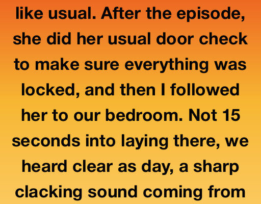 My wife and I were on the couch, watching our favorite cooking show like we did every Friday night. After the episode ended, she did her usual routine of checking the doors to be sure everything was secure. I followed her to the bedroom, the soft glow of the hallway light fading behind us….