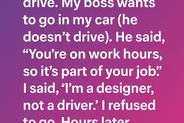 My boss and I were required to meet a client twice a week, a 35-minute drive away. Since he didn’t drive, he assumed I’d take him in my car, insisting it was “part of my job” because it was during work hours. I calmly explained, “I’m a designer, not a driver, and my car…