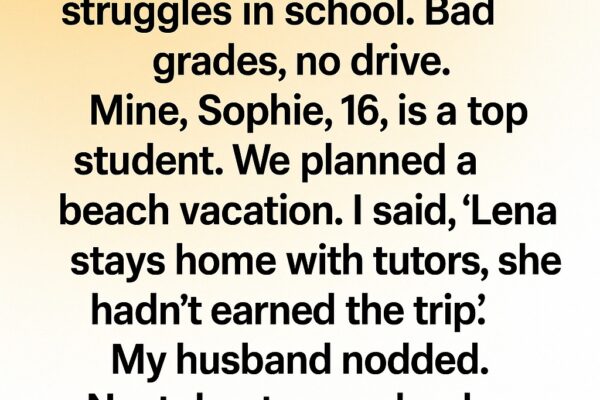 My husband and I have kids from ex marriages. His daughter Lena, 15, struggles in school. Bad grades, no drive. Mine Sophie, 16, is a top student. We planned a beach vacation. I said, ‘Lena stays home with tutors, she hadn’t earned the trip.’ My husband nodded. Next day, to our shock, we saw…