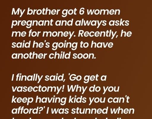 My brother got 6 women pregnant and always asks me for money. Recently, he said he’s going to have another child soon. I firmly said, “Get a vasectomy! Why do you keep having kids you can’t afford?” I was stunned when he dropped a bombshell: “Actually, it’s because… I want a big family like…