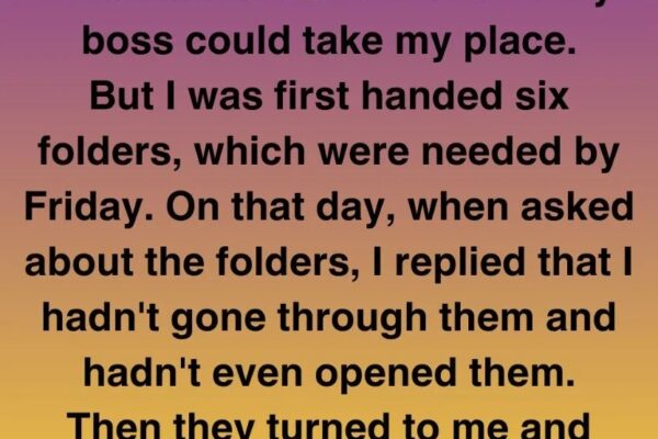 I was laid off so a friend of my boss could take my place. But I was first handed six folders, which were needed by Friday.   On that day, when asked about the folders, I replied that I hadn’t gone through them and hadn’t even opened them. Then they turned to me and looked…