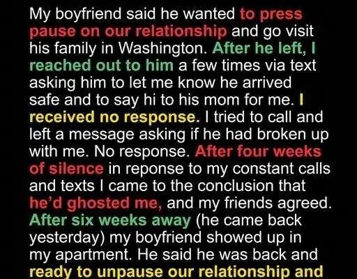 • My Boyfriend Left Saying He Needed a Break and Ghosted Me for a Month—Yesterday He Came Back and Yelled