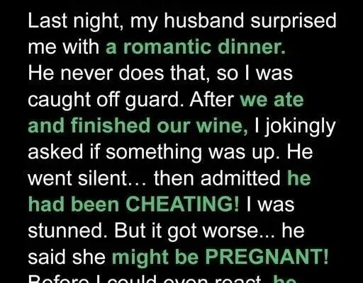 Last night, my husband surprised me with a romantic dinner. He never does that, so I was caught off guard. After we ate and finished our wine, I jokingly asked if something was up. He went silent… then admitted he had been CHEATING! I was stunned. But it got worse… he said she might…