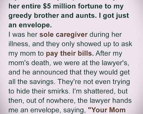 My mom, who just passed away, left her entire $5 million fortune to my greedy brother and aunts. I got just an envelope. I had been her caregiver through every sleepless night and doctor’s visit, while they only came around when they needed money. Sitting in the lawyer’s office, I felt invisible as he…