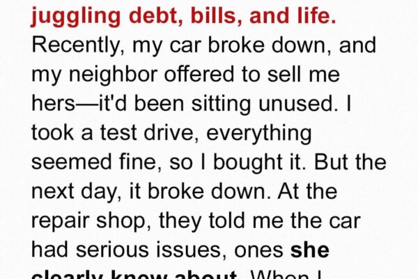 Three years after losing my husband in a wreck, I was barely surviving—working two jobs while raising Dora and Ethan. When my old minivan died, my wealthy, polished neighbor Cheryl swooped in with a “deal”: her nephew’s Toyota for $2,500, “practically new.” Desperate, I bought it. Within a day, it broke down, and the mechanic…