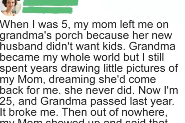 I was just five when my mom dropped me off at Grandma Rose’s doorstep, mascara running as she explained her new husband   didn’t want kids. “This is best for everyone,” she whispered before kissing my forehead and walking away without looking back. I cried, clutching my stuffed bunny, as Grandma wrapped me in her…