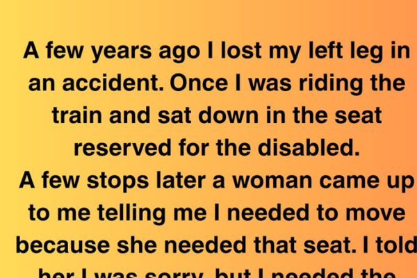 A few years ago, I lost my leg in an accident. One hot day, I boarded a crowded train and sat in a priority seat, my prosthetic hidden beneath loose pants. A woman soon demanded I move, accusing me of faking a disability. I calmly pulled up my pant leg to reveal the truth, but…