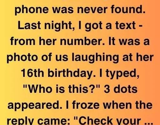 My best friend perished in a vehicle crash 7 years ago. No one found her phone. A SMS from her number arrived last night. A photo of us giggling during her 16th birthday. I typed “Who is this?” We saw 3 dots. I froze when told, “Check your” Looking at the message, my palms…