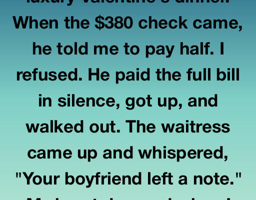 My boyfriend insisted on a luxury Valentine’s dinner. When the $380 check came, he told me to pay half. I refused. He paid the full bill in silence, got up, and walked out. The waitress came up and whispered, “Your boyfriend left a note.” My heart dropped when I read it. It said, “Since…