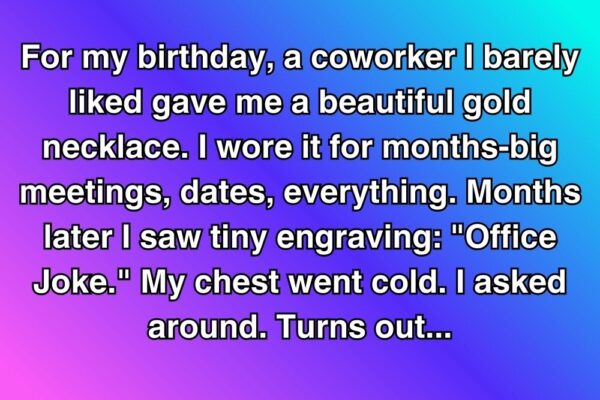 A Gift with a Hidden Punchline For my birthday, a coworker I barely knew gave me a glittery gold necklace. I wore it everywhere, feeling elegant—until months later, I noticed a tiny engraving on the back: “Office Joke.” My chest went cold. Turns out, a few teammates had bought it as a prank gift for someone they…