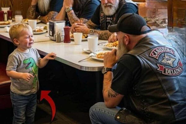 The diner buzzed with easy laughter as fifteen veteran bikers crowded around two sticky tables, trading old war stories over cheap coffee. It was the kind of gathering that looked rough from the outside but felt like family on the inside. Then a little boy—no taller than the tabletop and wearing a faded dinosaur…