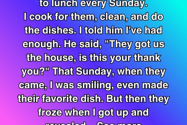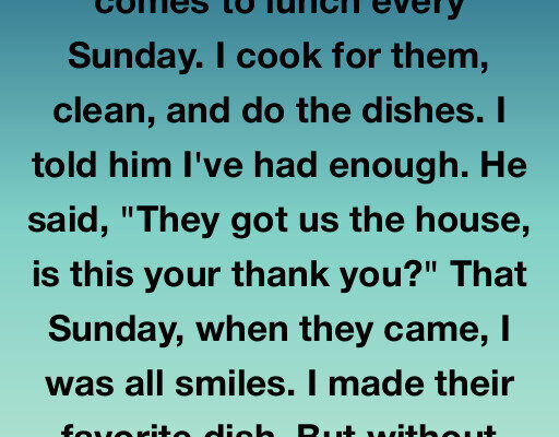Every Sunday at noon, his family poured into our house expecting a feast. I cooked, cleaned, and smiled while they laughed in the living room. When I finally told my husband I was tired of being treated like a servant, he brushed me off: “They got us the house. Is this your thank you?” That’s…
