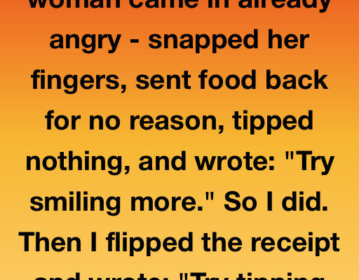 Used to wait tables. One woman came in already angry – snapped her fingers, sent food back for no reason, tipped nothing, and wrote: “Try smiling more.” So I did. Then I flipped the receipt and wrote: “Try tipping more.” She saw it and froze. For a second, she looked like she was about…
