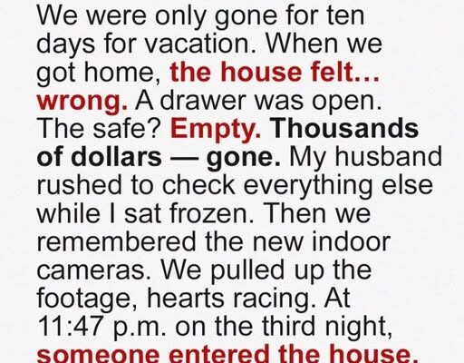 We were only gone for ten days on vacation, but the moment we stepped inside, something felt unsettling. A drawer was left open, items were scattered, and the safe we trusted was completely empty. Thousands of dollars in savings we had built over years were gone. My husband hurried to check the rest of…