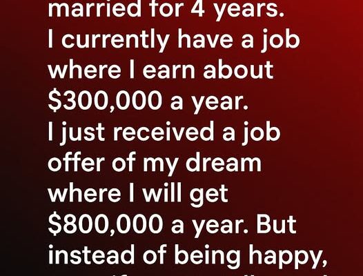 My wife (33F) and I (36M) have been married for 4 years. I currently have a job where I earn about $300,000 a year. I just received a job offer of my dream where I will get $800,000 a year. But instead of being happy, my wife got totally mad and said— that this…