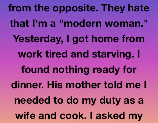 My husband comes from a “traditional” family. I come from the opposite. They hate that I’m a “modern woman.” Yesterday, I got home from work tired and starving. I found nothing ready for dinner. His mother told me I needed to do my duty as a wife and cook. I asked my husband if…